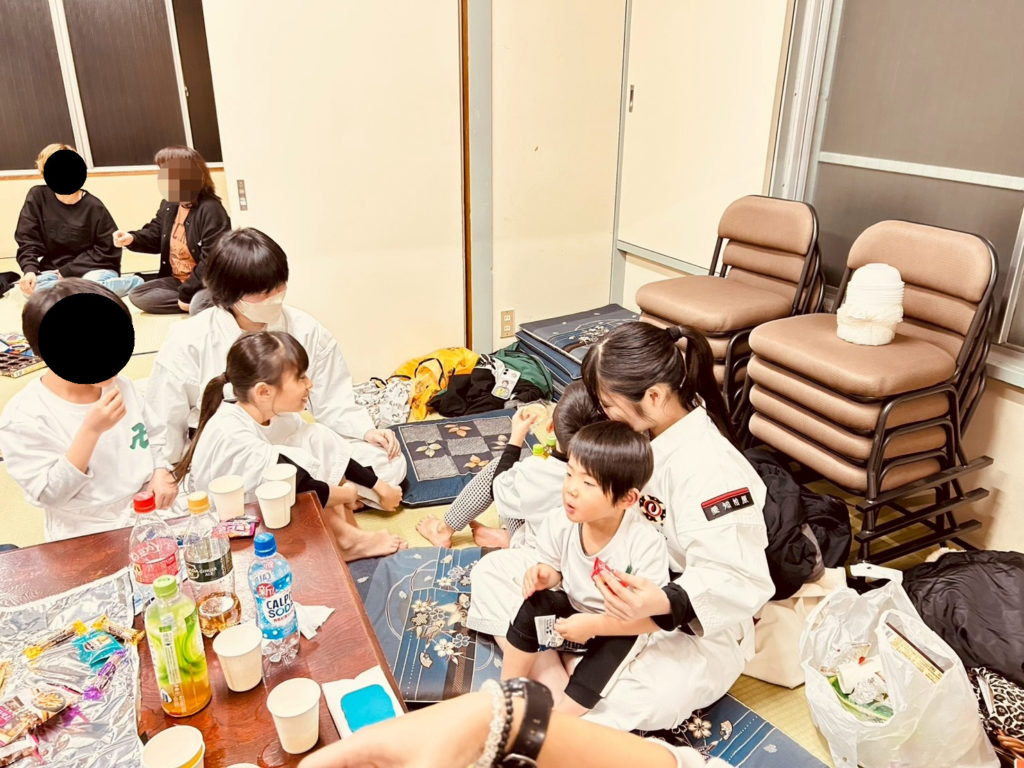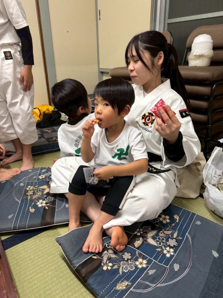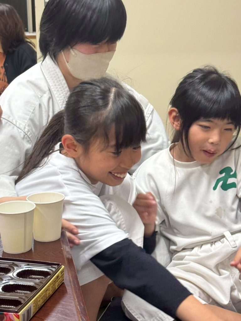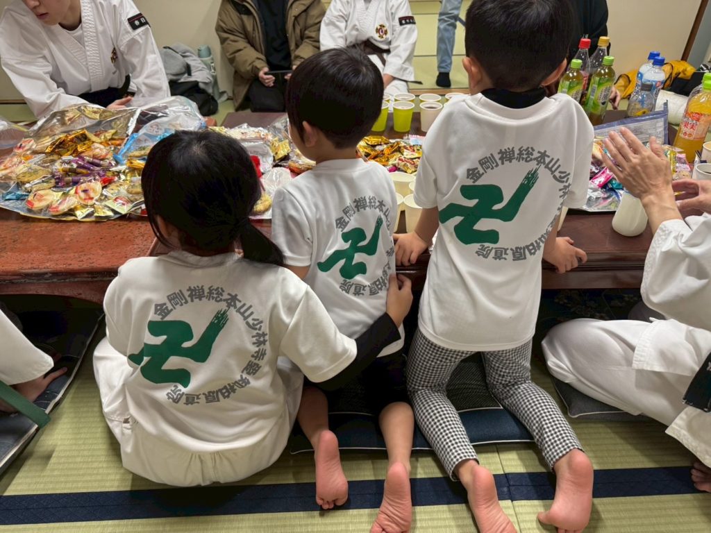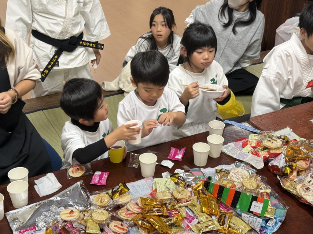 式典の後は、恒例の「お楽しみ交流会」です。拳士たちは、温かいぜんざいを囲みながら談笑。 「冬休みは何をして過ごした?」「今年の目標は?」と、学年や年齢の垣根を越えて笑顔が弾けます。 愛知柏原道院の魅力は、こうした家族のようなアットホームさにあります。
