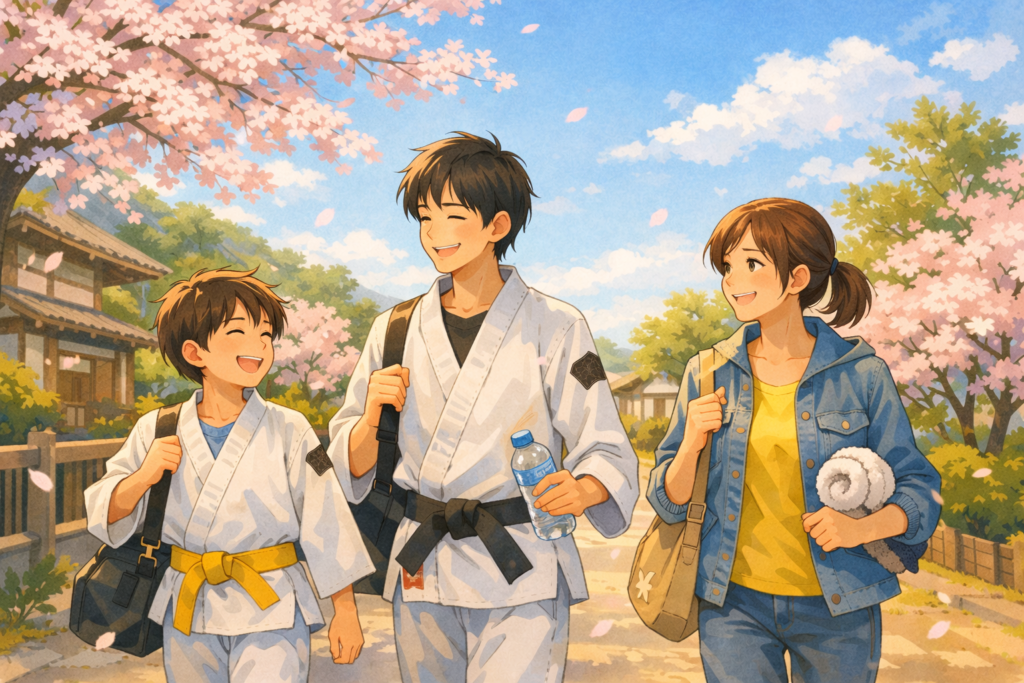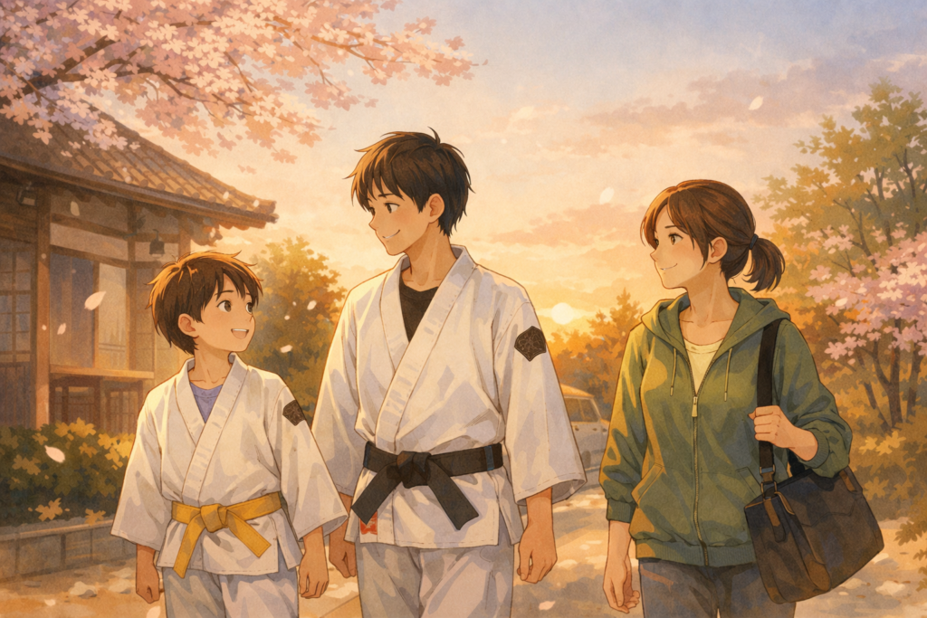 親子で同じ道衣を着て汗を流す姿。 年齢を重ねても、仲間とともに身体を動かす姿。